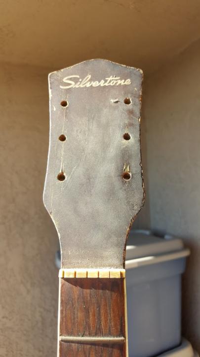 Fast forward 57 years and a few months ago. I was talking to my bowling partner who is the same age as me and told him about my old Silvertone and he told me that his folks bought him the very same guitar in the very same year (1959) only his was the sunburst. He said, "I've still got it up in the attic where it's been collecting dust.... do you want it?" ARE YOU KIDDING?????? So he gave it to me and it was in pretty bad shape. No hardware and the fretboard was all corroded and crusty. Anyway here are some shots of it: