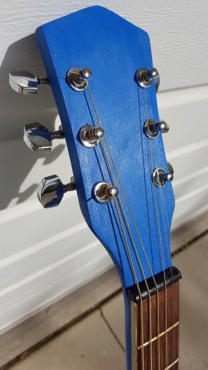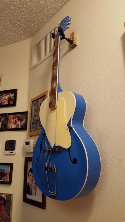 So I went to work on it. My goal was to try to make it look like my own original. After 4 months and lots of fun, I finally finished it last week. I ordered new hardware off eBay and now it proudly hangs on my wall. Of course, it's not playable; the neck needs a reset (there's no truss bar) so the strings are real slack. It's just for looks. Boy does that bring back some sweet memories. Hope you enjoy: